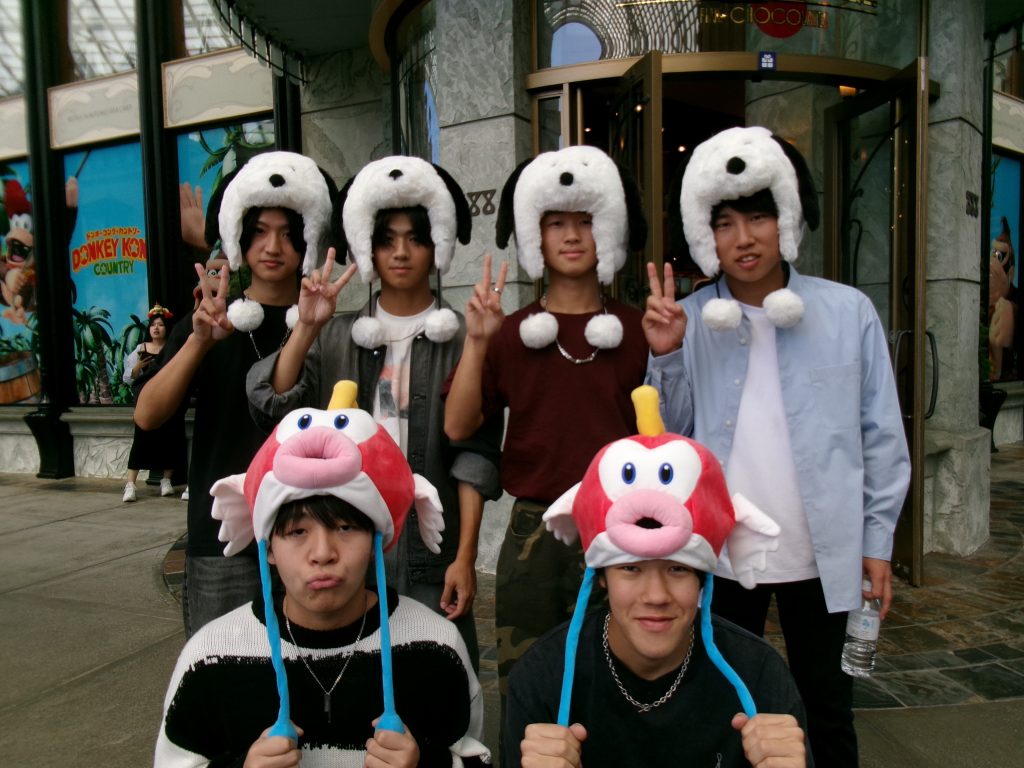 最終日はUSJへ。思いきり笑って、写真を撮って、最高の思い出をつくりました。みんなでお揃いの被り物をする生徒たちの弾ける笑顔が、とても印象的でした。
